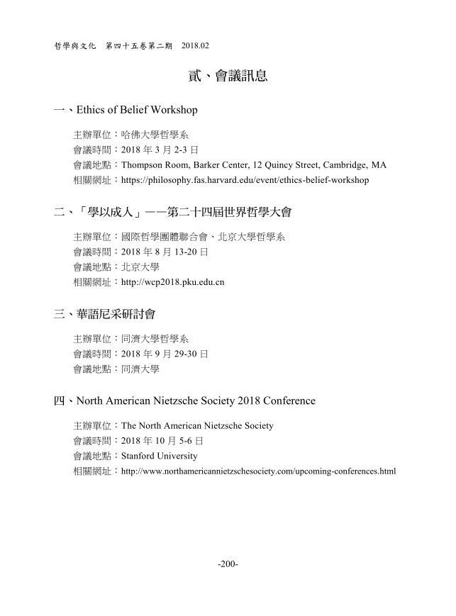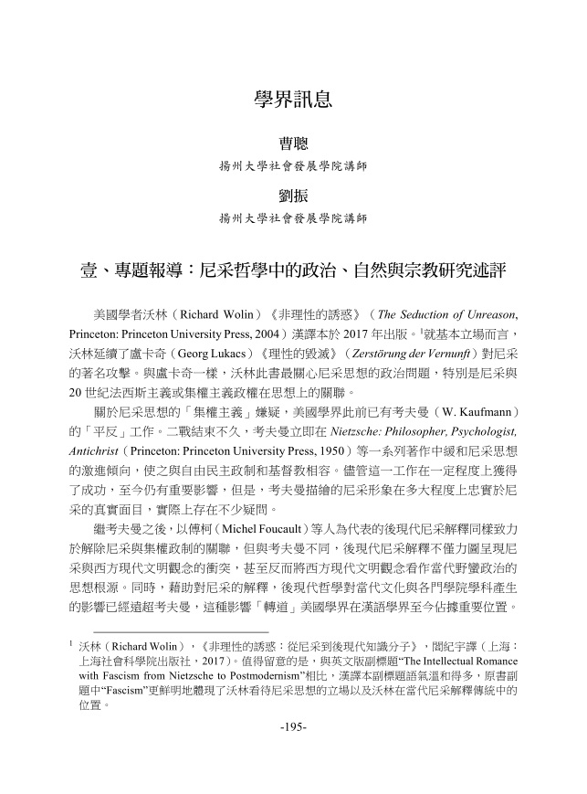 《哲学与文化》2018年第2期刊发我院青年教师曹聪、刘振博士撰写的 “学界讯息”,包括专题报道“尼采哲学中的政治、自然与宗教研究述评”与近期“会议讯息”。《哲学与文化》(Universitas Monthly Review of Philosophy and Culture)系台湾辅仁大学主办,现为A&HCI索引期刊。