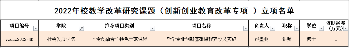12月19日,2022年校教学改革研究课题(创新创业教育改革专项)立项结果揭晓,我院赵墨典老师的《哲学专业创新基础课程建设及实施》获立“专创融合”特色示范课程项目。