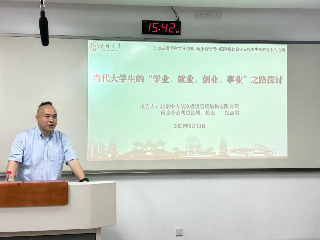 2023年5月13日下午,北京中方信富投资管理咨询有限公司南京分公司总经理、扬州大学93届校友纪志军先生在瘦西湖校区8号楼S109,为我院2020级本科生及部分研究生作《当代大学生的“学业、就业、创业、事业”之路探讨》主题分享会,分享会由学院党委副书记杨方主持。