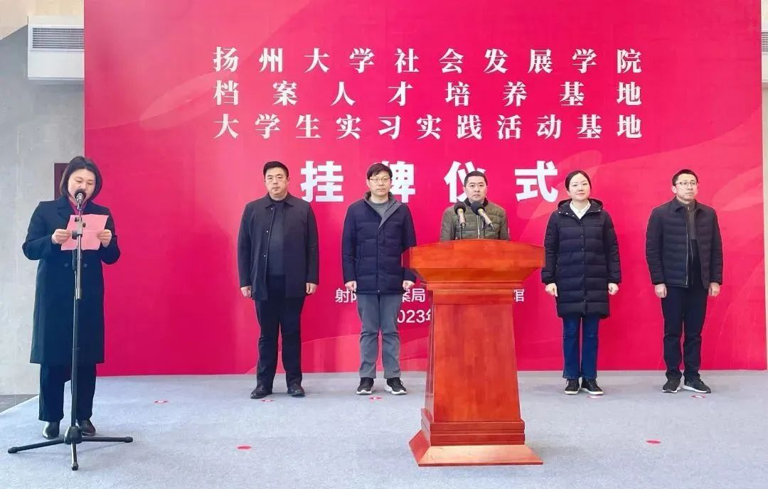 为落实“访企拓岗”专项行动,进一步提高专业人才培养质量,拓宽我院学生实习实践、就业渠道,2023年12月26日上午,我院“档案人才培养基地”“大学生实习实践活动基地”挂牌仪式在射阳县档案馆举办。