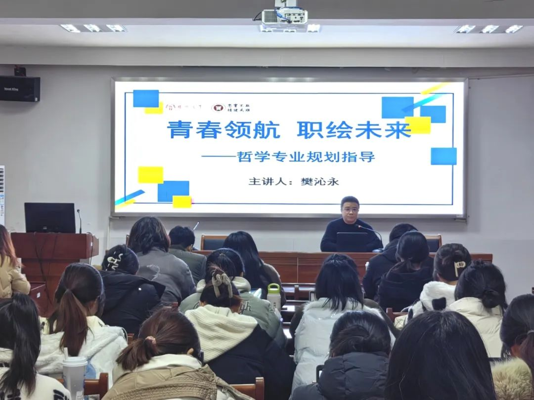 为提升学生专业认知素养,助力职业发展规划,我院于2024年12月13日下午,瘦西湖校区44号楼108教室举办“青春领航,职绘未来”哲学专业规划指导讲座。本次讲座由哲学教研室主任樊沁永主讲,团委书记、学工办主任陶金沙,辅导员田华以及哲学专业大一大二年级全体同学参加此次讲座。