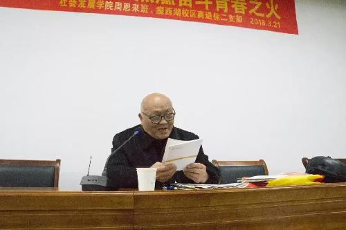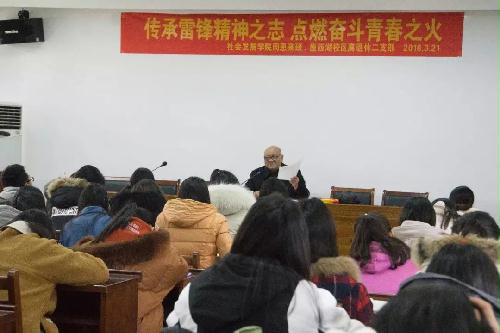 为了让学生们学习和践行雷锋精神,3月21日下午,我院在学院一楼报告厅为历史1601周恩来班的学生们举办“传承雷锋精神之志,点燃奋斗青春之火”讲座。此次讲座邀请关工委曹永贵老师作为主讲人,院团委书记肖薇老师,院辅导员杜媛老师及全体党员参加此次讲座。