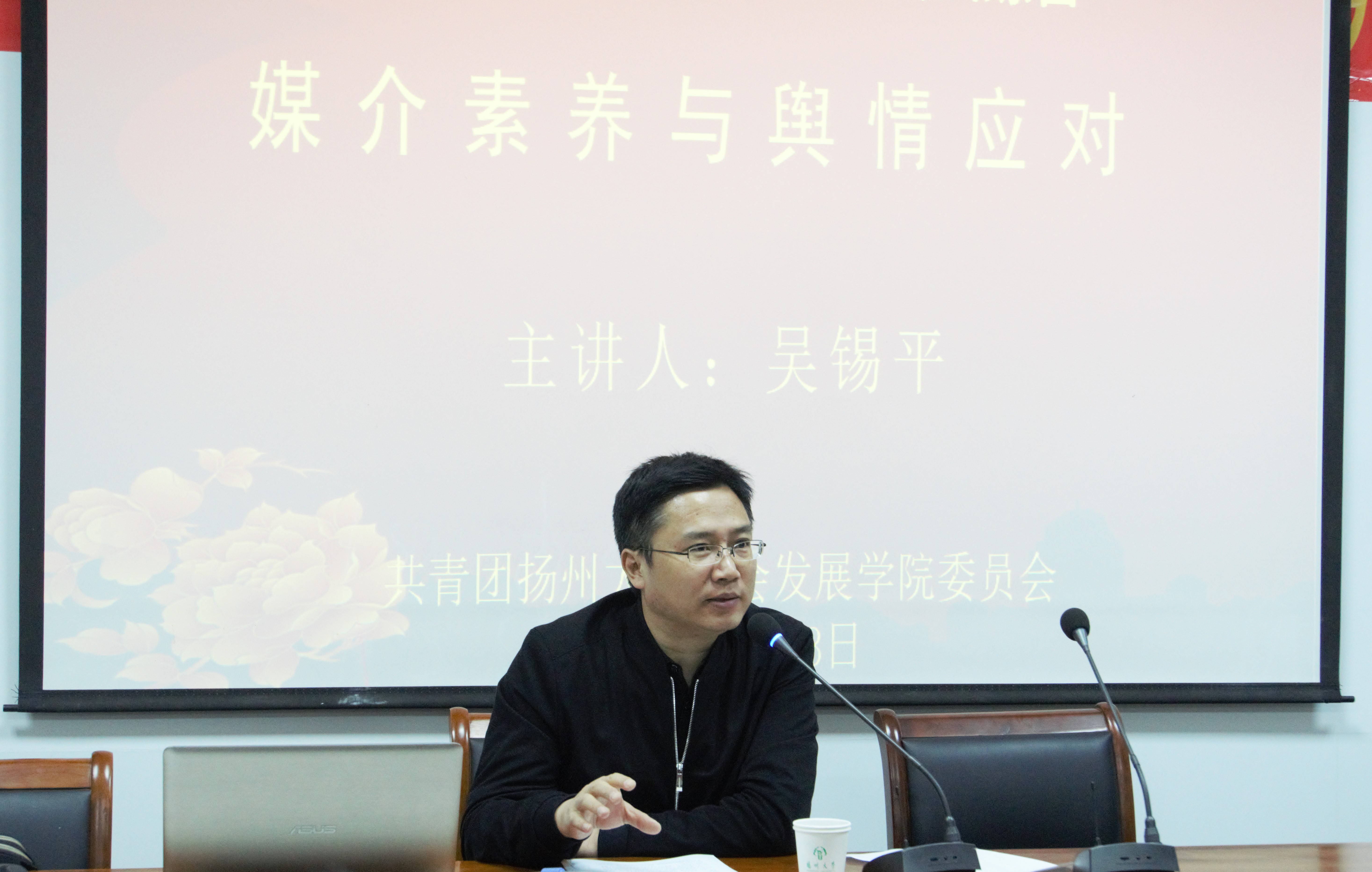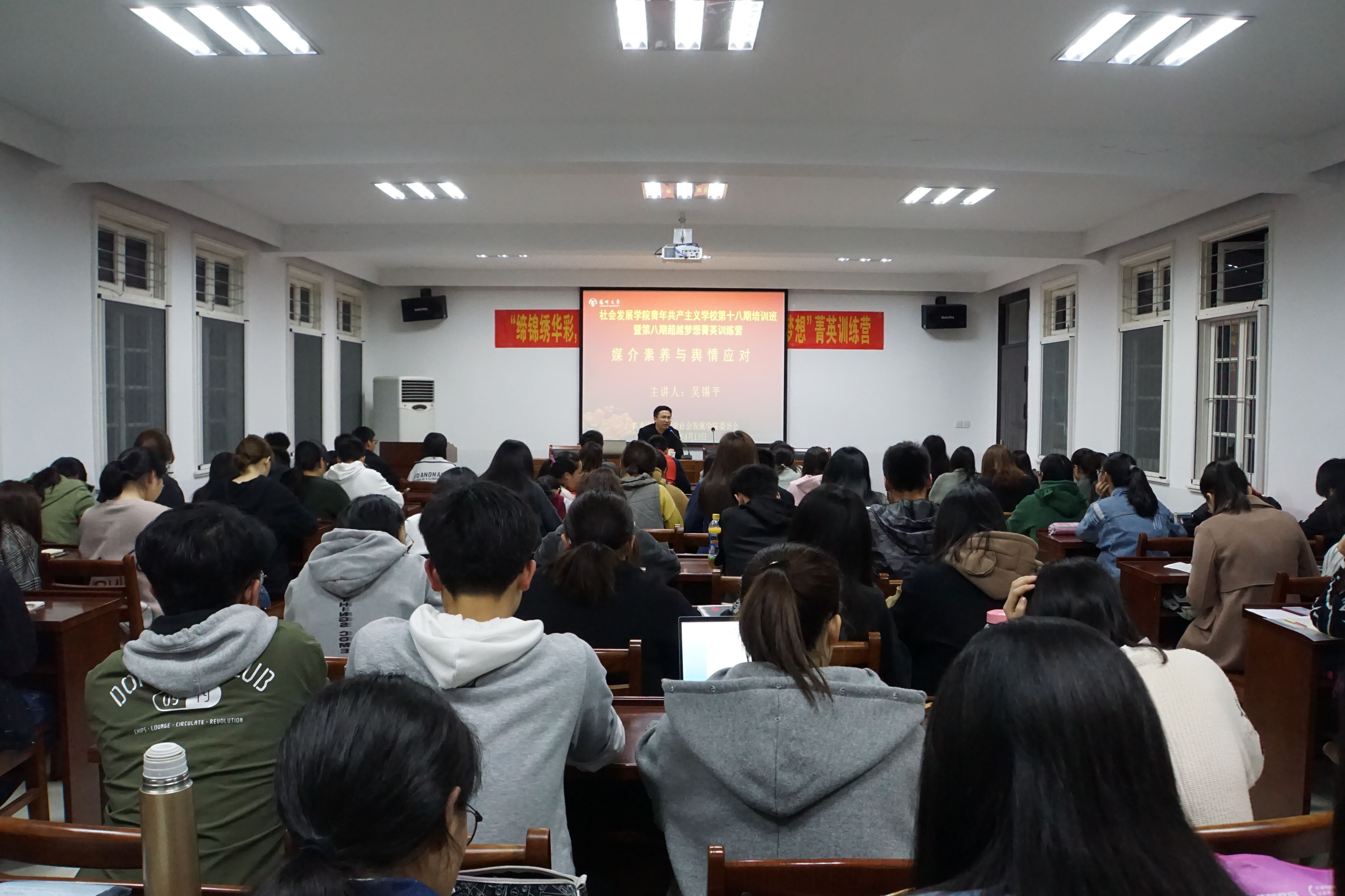 为提升我院学生活动新闻点的意识,4月13日我院邀请校党委宣传部副部长吴锡平老师,以“媒介素养和舆情应对”为主题在学院一楼报告厅给菁英训练营的学生们开展了一场讲座。吴老师从媒体发展历程、大学生提升媒介素养、舆情应对三个方面作了详细介绍。我院辅导员杜媛老师参加并主持此次讲座。