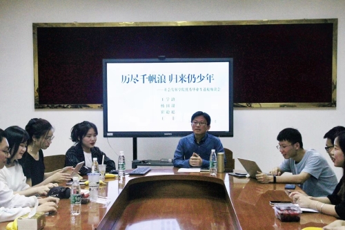5月22日晚,我院优秀毕业生返校座谈会在二楼会议室举行。目前就读于浙江大学的王学路、杨田甜、崔聪聪和王菲四位优秀学子就读书、考研、工作等话题与母院的学弟学妹们进行了深入的交流分享。座谈会由哲学系郭小军老师主持,哲学系各年级本科生、部分研究生及其他专业同学共四十余人参加了座谈会。