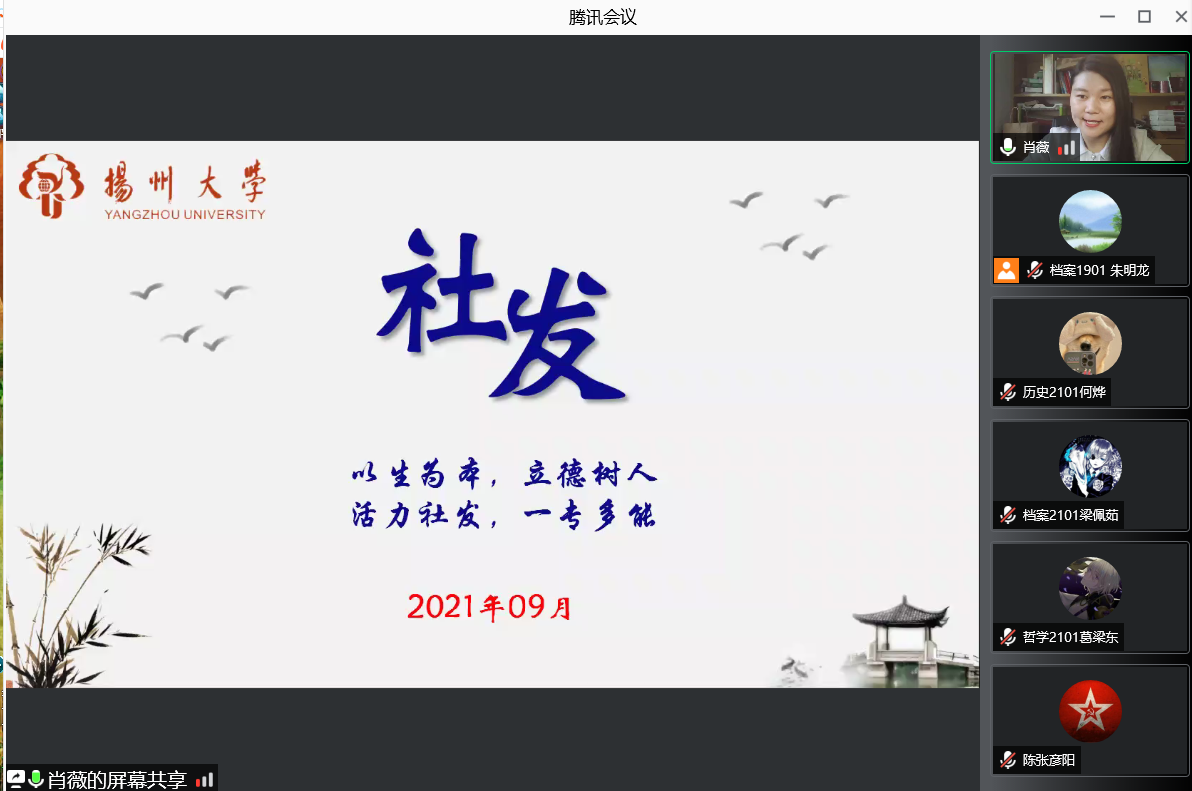 根据疫情防控的要求,我院21级的新生将于10月17日来校报道,在进入大学前夕,为帮助同学们更全面地了解扬州大学,培养同学们对社会发展学院的热爱之情,9月24日上午,我院特别开展了“百年扬大 魅力社发”知校爱校教育专题活动,院团委书记肖薇老师及我院21级全体新生参加了本次活动。
