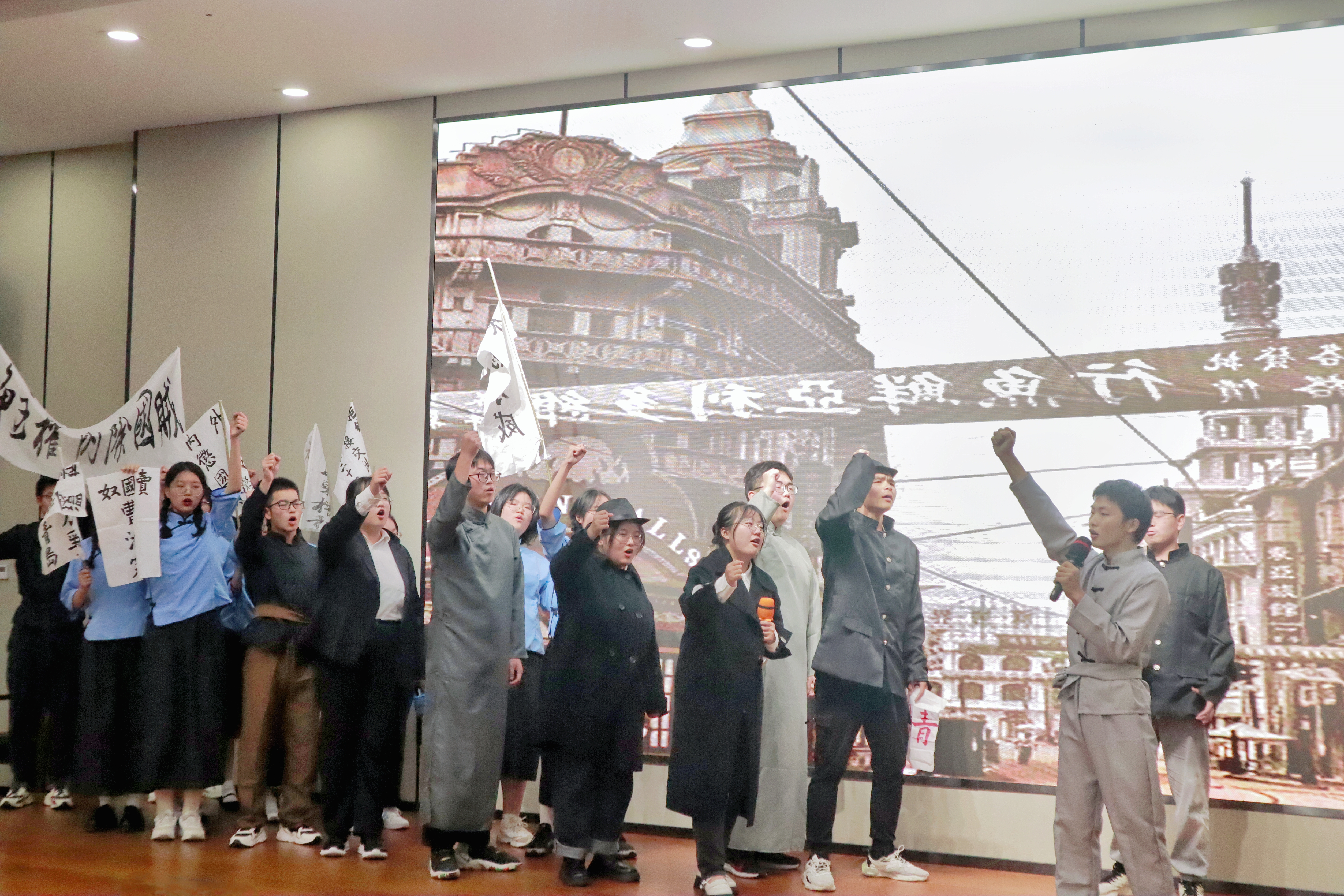 一首Rap《危险派对》,让比赛刚开始的气氛就火热起来;热舞《Bet on me》更是将青春的张扬与明艳诠释到了极致。青春的多姿多彩和欢乐难忘在《New Boy》的音乐中倾泻而出,“新世纪来的像梦一样”,新世纪,也是我们当代青年大展拳脚的时候呢!话剧《觉醒》将我们带回了那个风雨如晦的年代——固然年代动荡不安,青年却热血澎湃,这让我们更明确了身上肩负的责任,坚定了砥砺前行的决心。