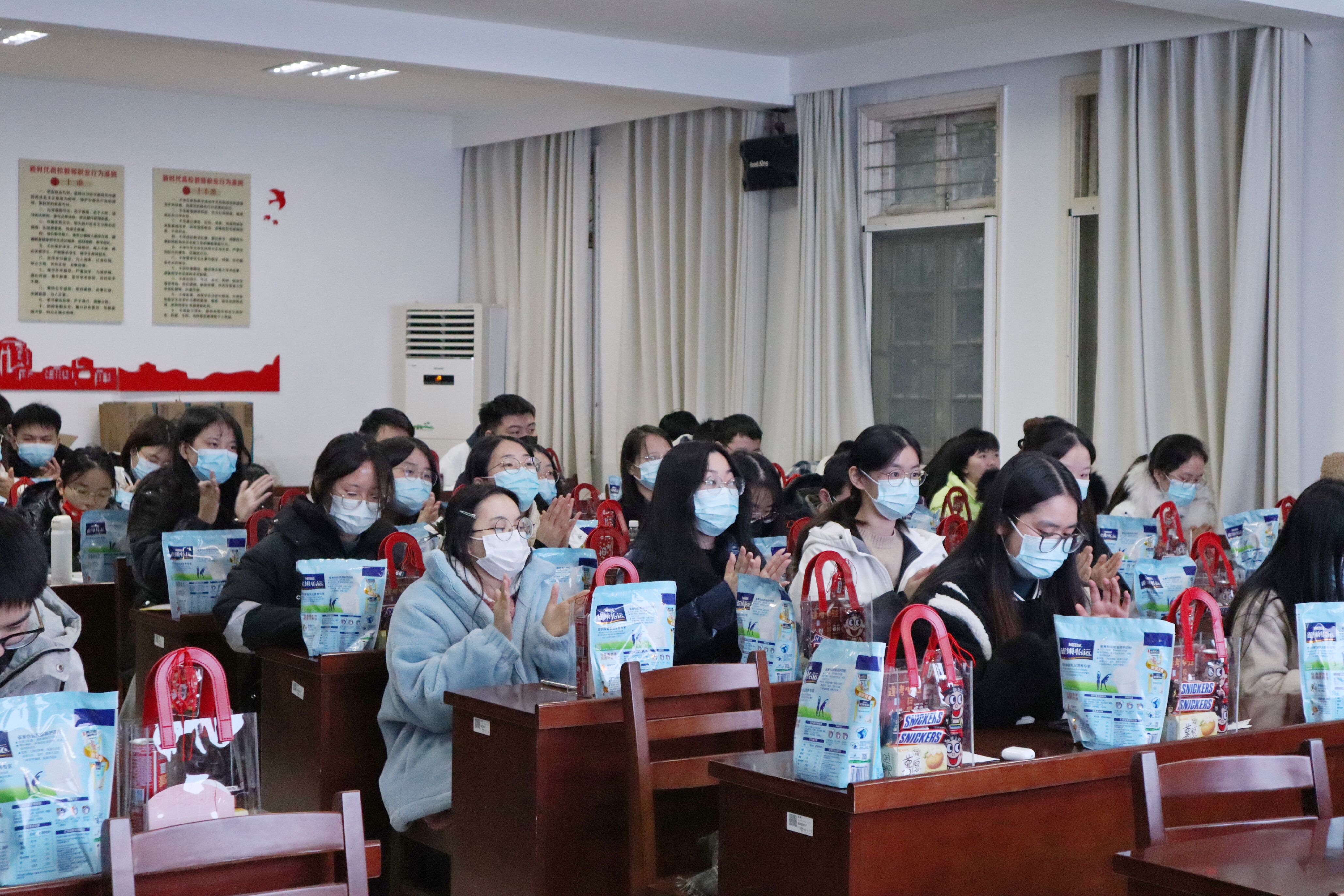 大会由我院团委书记肖薇老师对学子们亲切体贴的问候开始。她介绍道,摆放在同学们面前的“考研礼盒”都是由我院的各位辅导员、老师精心准备、亲手打包,其中有寓意着“前程似锦”的笔记本、“士气高昂”的士力架、“薯”你最棒的薯片、“状态旺、成绩旺”的旺仔牛奶,更有“金榜题名”的福牌承载着深切祝福,她还提醒同学们要做好考前的物质准备,以防万一。