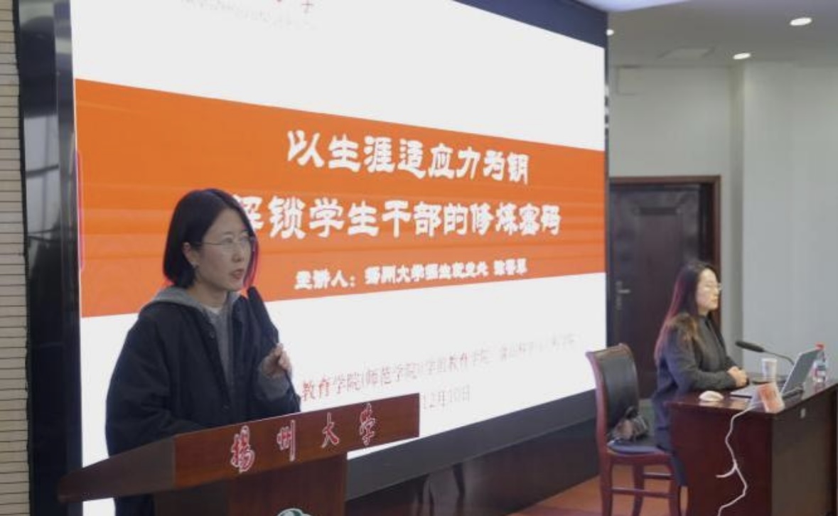 为进一步强化学生干部的责任意识与履职能力,充分发挥学生骨干的引领示范作用,12月10日,我院联合教育学院(学前教育学院)、食品与工程学院在扬子津校区笃行楼N302报告厅共同举办了以“以生涯适应力为钥,解锁学生干部的修炼密码”为主题的学生干部培训活动。本次活动特别邀请校招生就业处副处长徐香翠授课。三家学院主要学生干部参加活动。活动由社会发展学院党委副书记李刘静主持。