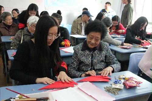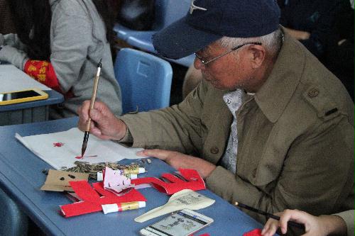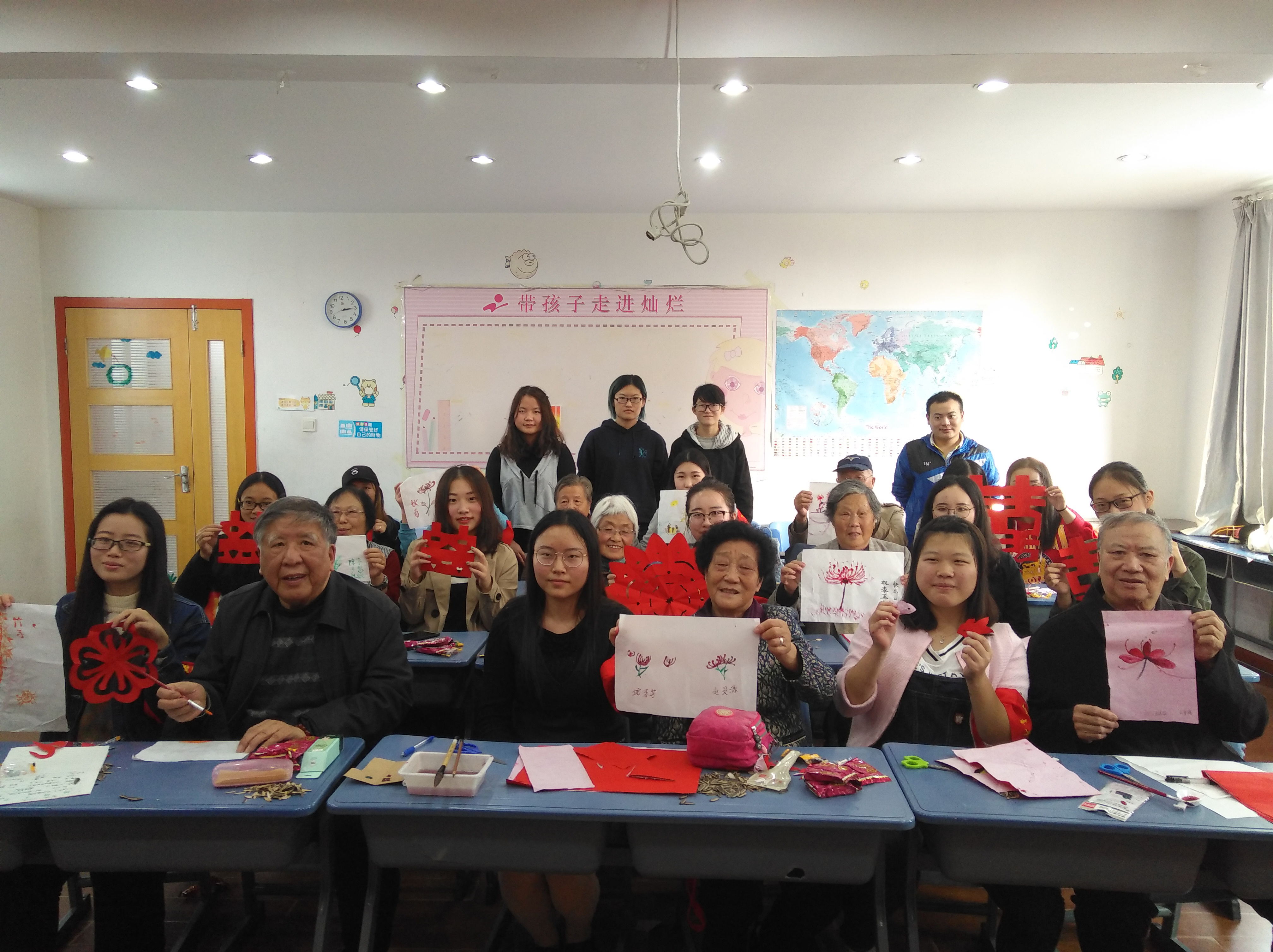 演出过后,志愿者们陪着老人们一起剪纸、画菊。老人们热情高涨。在志愿者们的帮助下,老人们用剪刀细致地剪出红双喜等图案。在画菊花的环节,志愿者与老人们一起,用画笔和颜料将菊花呈现在画纸上。“陈同学画的菊花真像,给你点一个大大的赞。”79岁高寿的娄国兴老人赞叹道。“祝李正清奶奶快乐长寿。”志愿者徐子涵在刚刚完成的菊花图上写道。最后,大家评选出最美的一幅作品,给老人送上礼物,并和老人们一起合影留念。