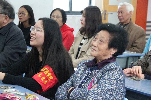 “遥知兄弟登高处,遍插茱萸少一人……”,志愿者邵丹正在介绍重阳节的来历以及与重阳节有关的诗句。活动伊始,志愿者亲切地与老人交谈,询问老人的身体状况,聊着家长里短,并邀请老人分享自己的故事。老人们在分享故事的同时,也对大学生志愿者们提出了期望,“未来需要你们,你们要不断前进,为国家做出奉献。”