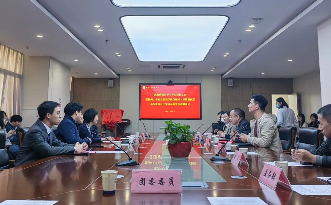 2024年3月21日下午,我院与扬州大学附属医院签约医务社工挂牌仪式在扬州大学附属医院成功举办。副院长程海霞、图书馆副馆长王汉林及社会工作专业教师代表黄金结、杨雪,扬州大学附属医院党委副书记单清、团委副书记李一帆及各志愿者代表出席活动。会议由扬州大学附属医院团委副书记李娟娟主持。