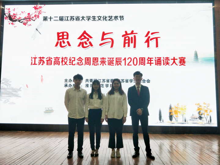 为深入学习贯彻习近平新时代中国特色社会主义思想和党的十九大精神,纪念周恩来总理诞辰120周年,5月24日,我院周恩来班学生王玥、李蓉、严嘉钰、历史1401班学生赵越代表学校在淮阴师范学院图书馆多功能厅参加由共青团江苏省委、江苏省学生联合会主办,淮阴师范学院承办的江苏省大学生“思念与前行”纪念周恩来诞辰120周年诵读大赛并荣获二等奖。