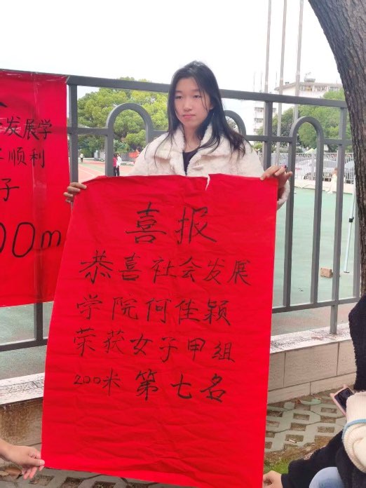 第三十届校运动会上,哲学2401班的何佳颖同学以顽强的斗志奋力拼搏,斩获女子甲组200米项目第七名,为学院争荣誉,为自己赢荣耀!