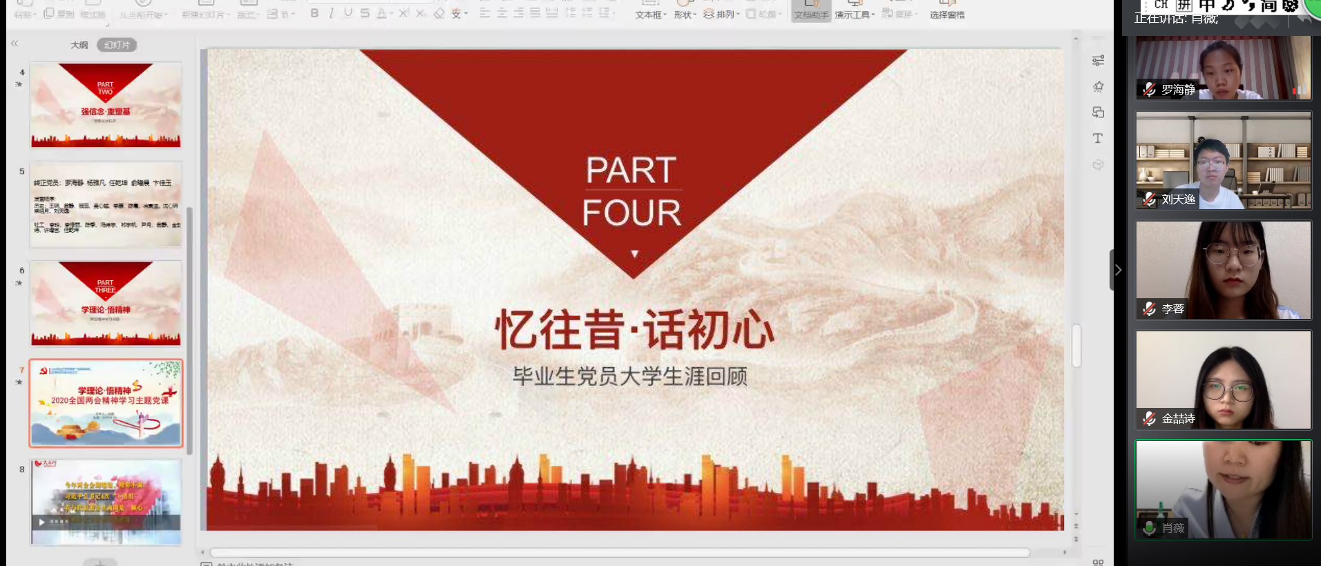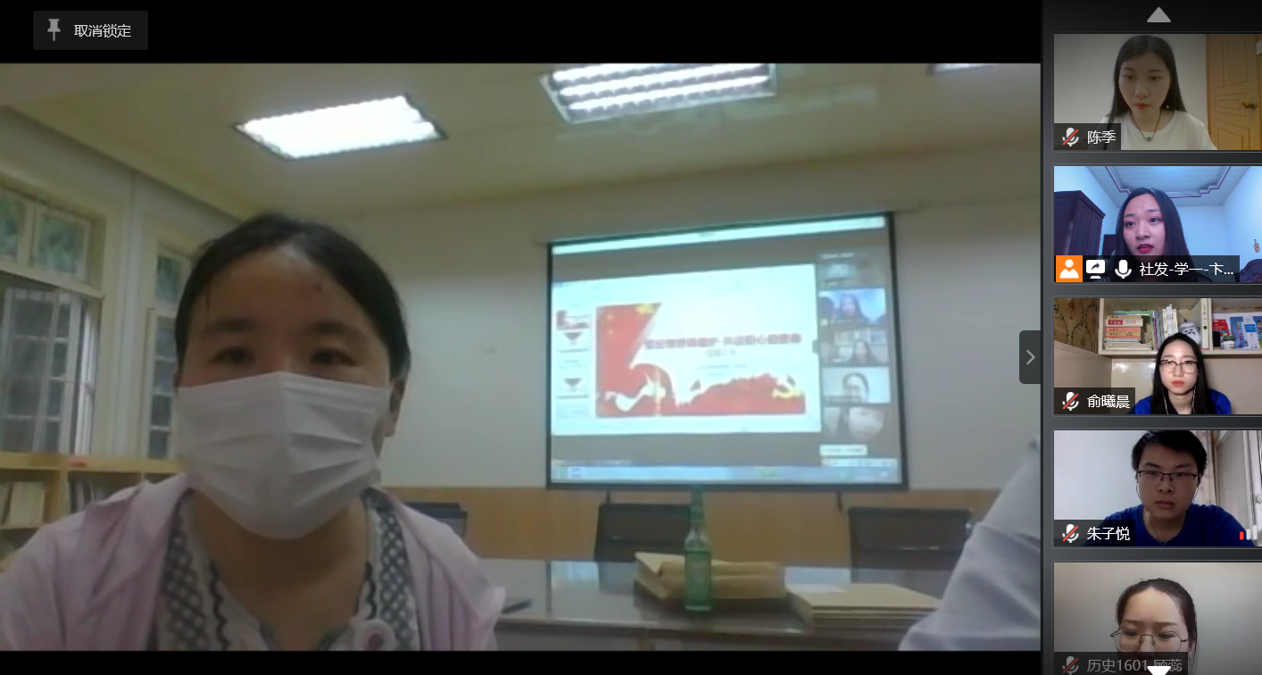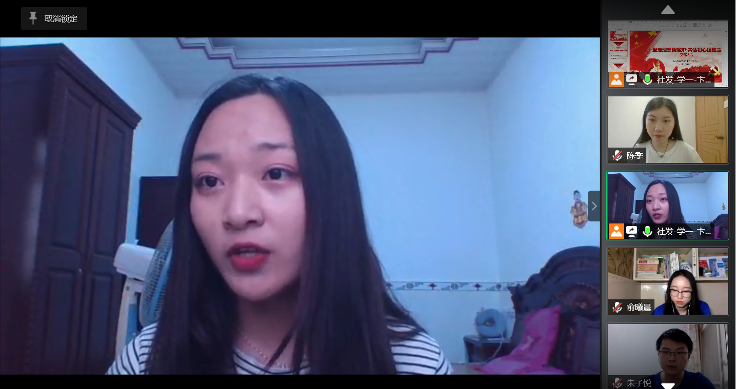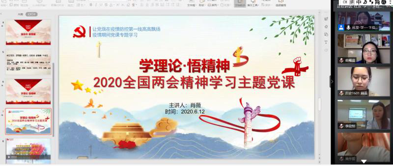 2020年两会期间,习近平总书记深刻阐述了“以人民为中心”的重大意义,明确提出了以人民为中心发展思想的实践要求,展现了中国共产党人的初心和使命,为我们党统筹推进疫情防控和经济社会发展工作,进一步指明了前进方向、提供了根本遵循。为贯彻落实习近平总书记在全国两会上的重要讲话精神,践行支部书记上好一节专题党课的相关要求,学生第一党支部于6月12日下午3点召开了“坚定理想铸熔炉·共话初心担使命”线上支部大会。会议由支部书记肖薇主持,支部全体党员参加。