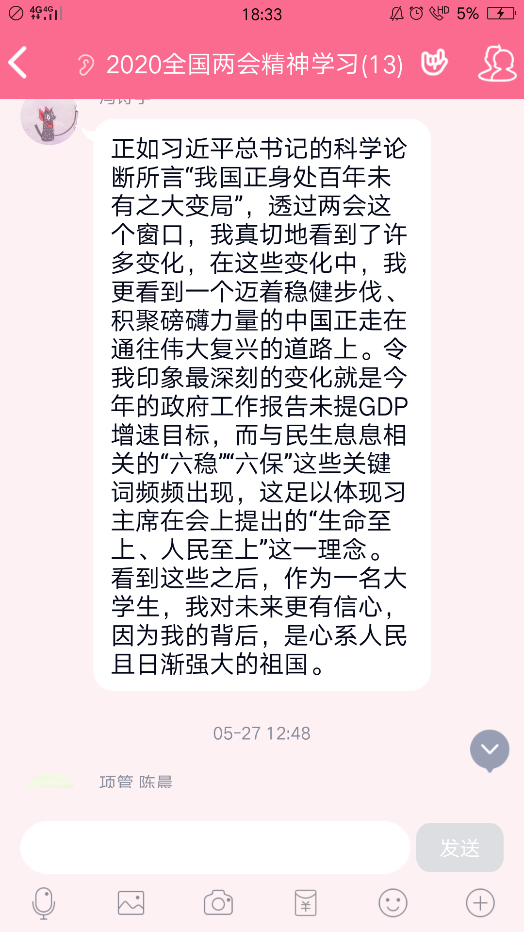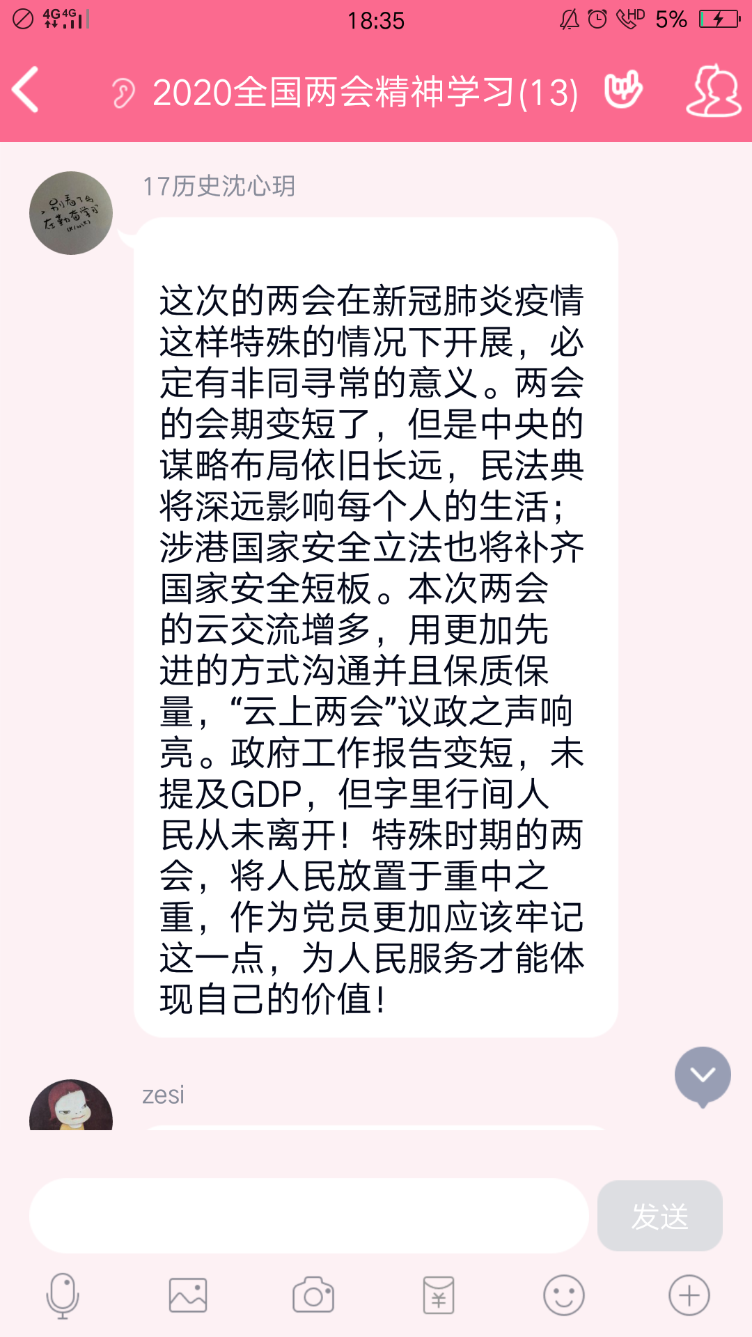 为切实推进支部学习两会精神,加强党员思想建设,学生第一党支部充分发挥全国样板支部的先锋模范作用,号召支部全体党员通过电视、网络、学习强国APP等形式关注、学习2020年全国两会情况,深刻领会和学习两会精神,并于支部联络群每日发表心得体会。