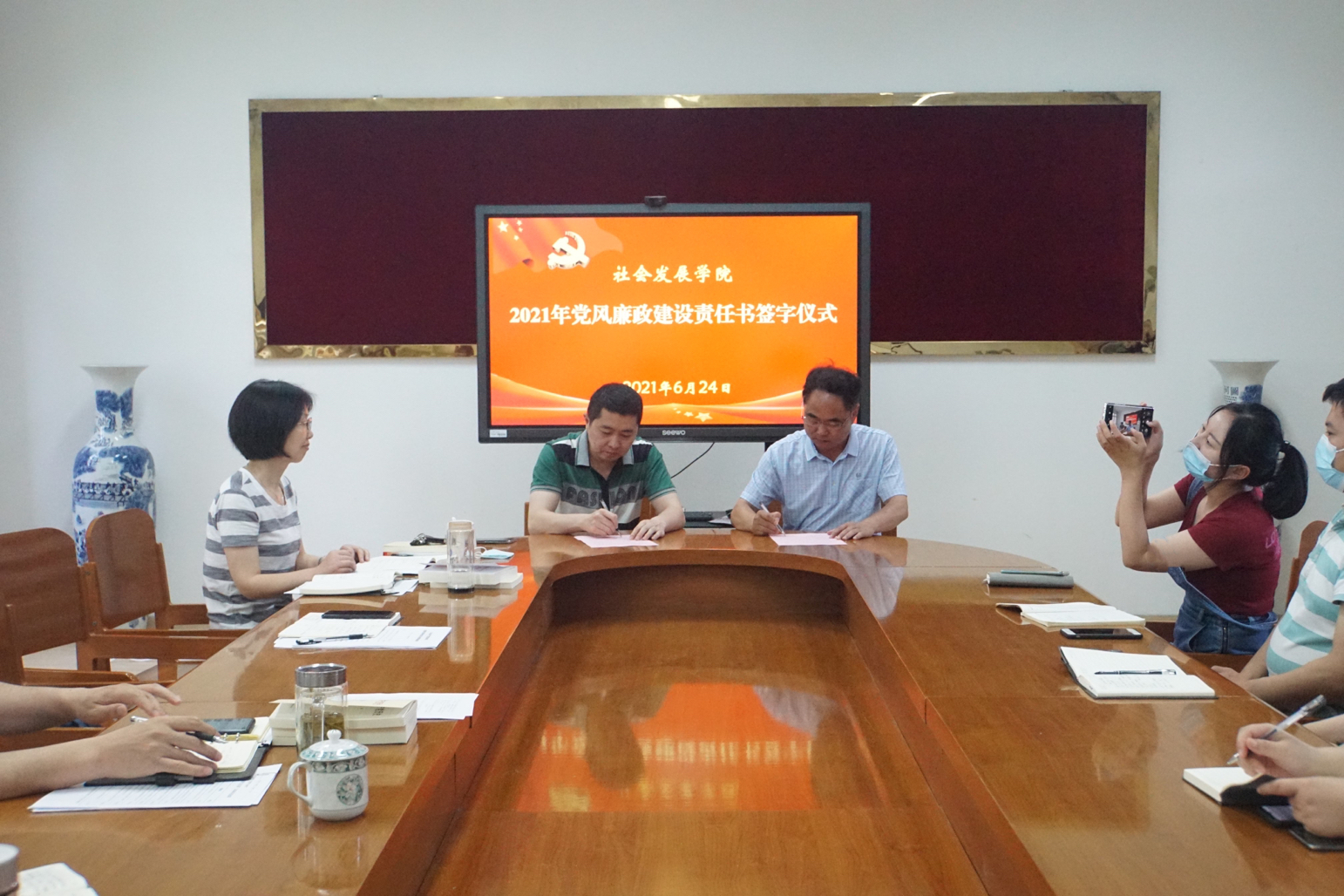 6月24日上午,院党委召开了2021年全面从严治党工作会议,全体院领导和中层干部参会。会上,院领导分别与责任对象签订了党风廉政建设责任书。