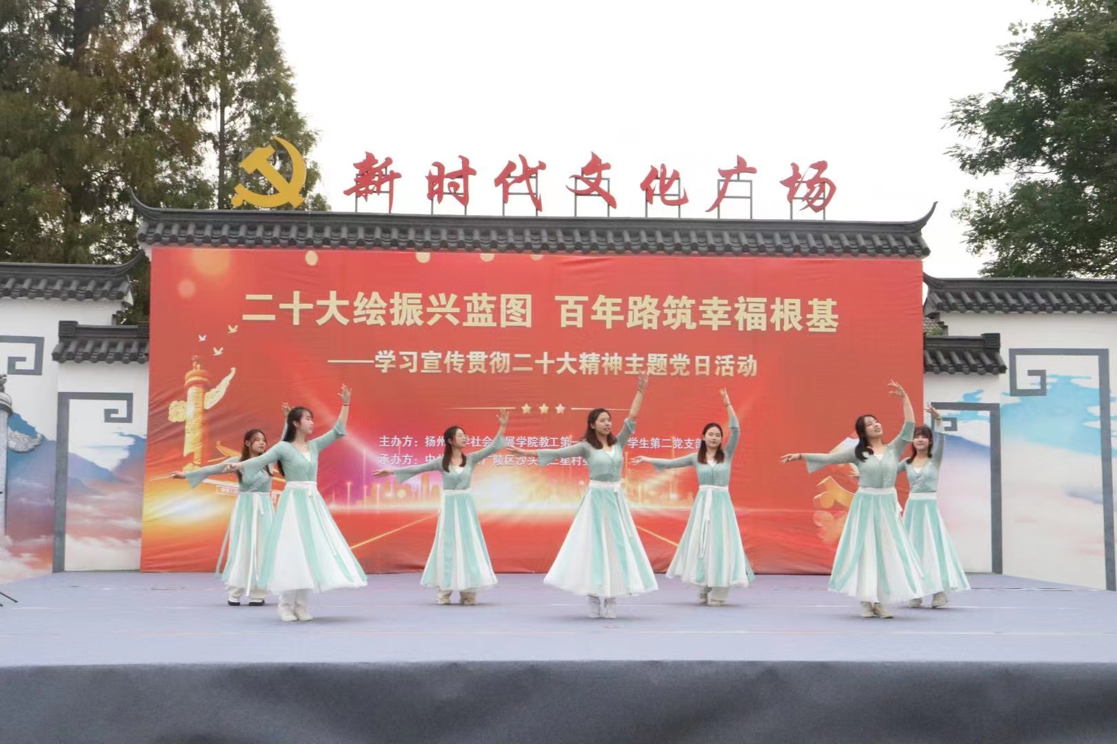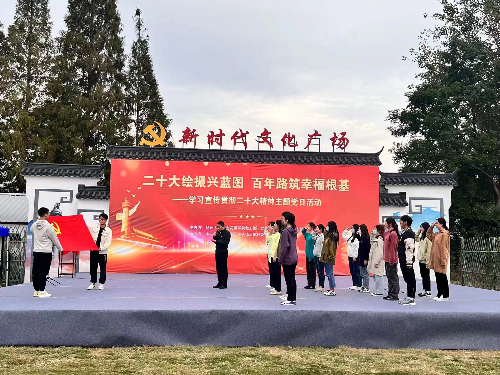 在沙头镇三星村新时代文化广场,学生第二党支部、教工第一党支部与三星村总支部委员会共同开展了“二十大绘振兴蓝图 百年路筑幸福根基”主题党日活动。师生党员以党的历史为主线,用文艺演出的形式将党史文化送进乡村,让党旗红成为乡村振兴发展的鲜亮底色。教工第一党支部书记、历史系教授雍正江现场讲授了党的历次全国代表大会发展历程主题党课。