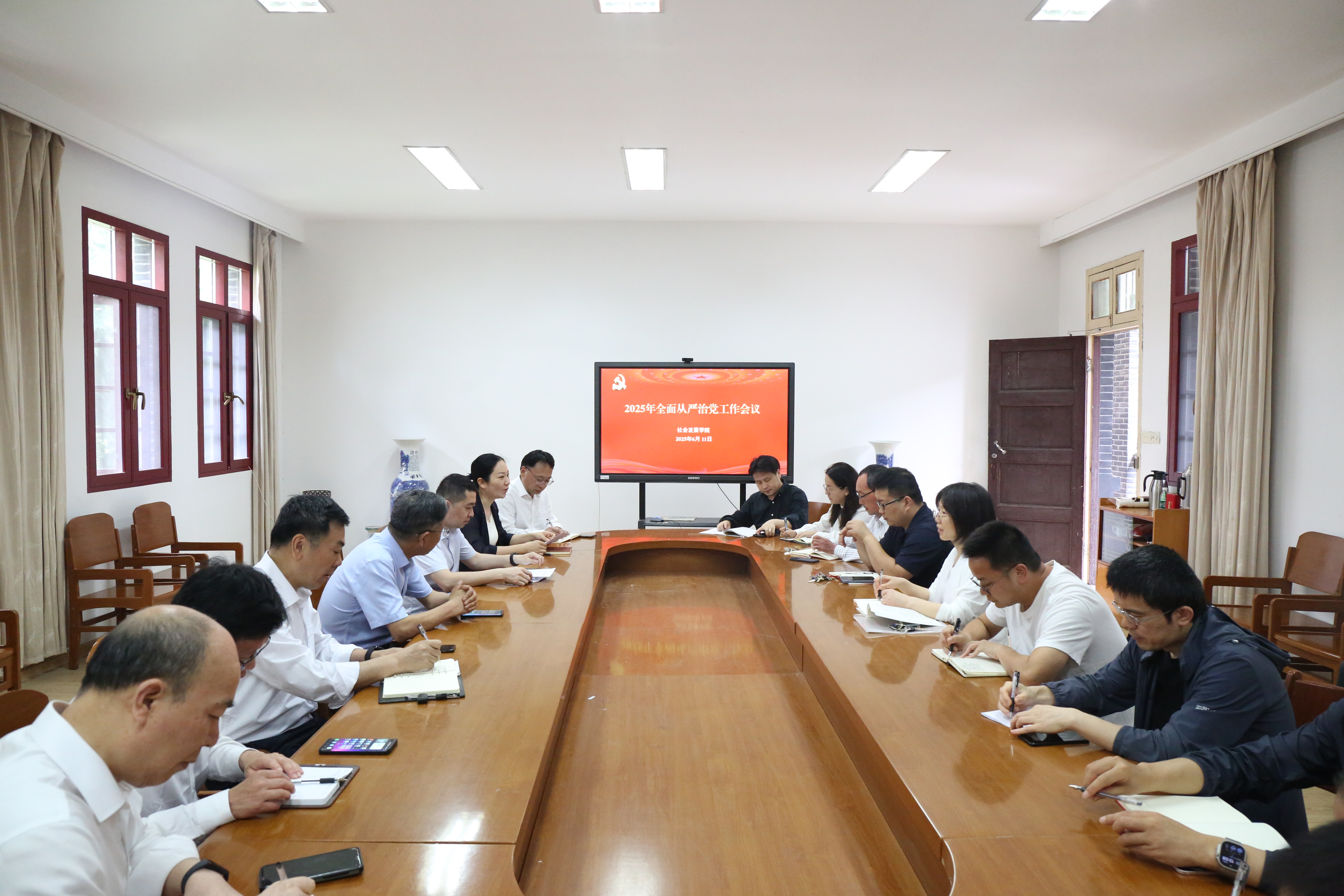 6月11日下午,学院在二楼会议室召开2025年全面从严治党工作会议,全体院领导、科级干部、各支部书记、各专业主任、教研室主任参加会议。校纪委委员、物理科学与技术学院党委书记王春雨到会指导,会议由院党委副书记杨方主持。