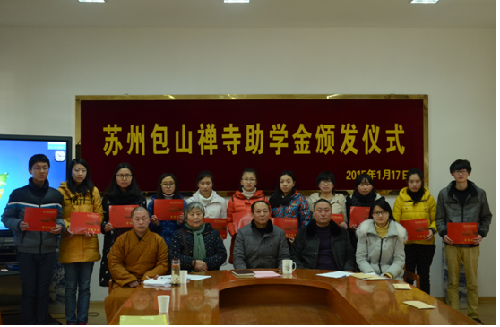 2015年1月17日上午10时,2014年度苏州包山禅寺助学金颁发仪式在院会议室成功举办。苏州市吴中区佛教协会副会长陈兰、苏州市吴中区佛教协会办公室主任柳威、包山禅寺计然法师、院党委副书记茅卫东老师、辅导员印月老师,以及12名受助同学参加颁发仪式。会议由印月老师主持。