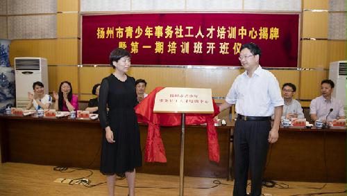 团省委权益部、扬州市民政局、扬州团市委、扬州大学团委和我院有关负责同志出席了揭牌仪式。140余名来自全市部分社区党团组织书记、部分从事青少年事务工作的社会组织负责人,以及参加2015年全国社会工作者资格证考试的各级团干部参加了扬州市青少年事务社会人才培训中心的第一期青少年事务专题培训。