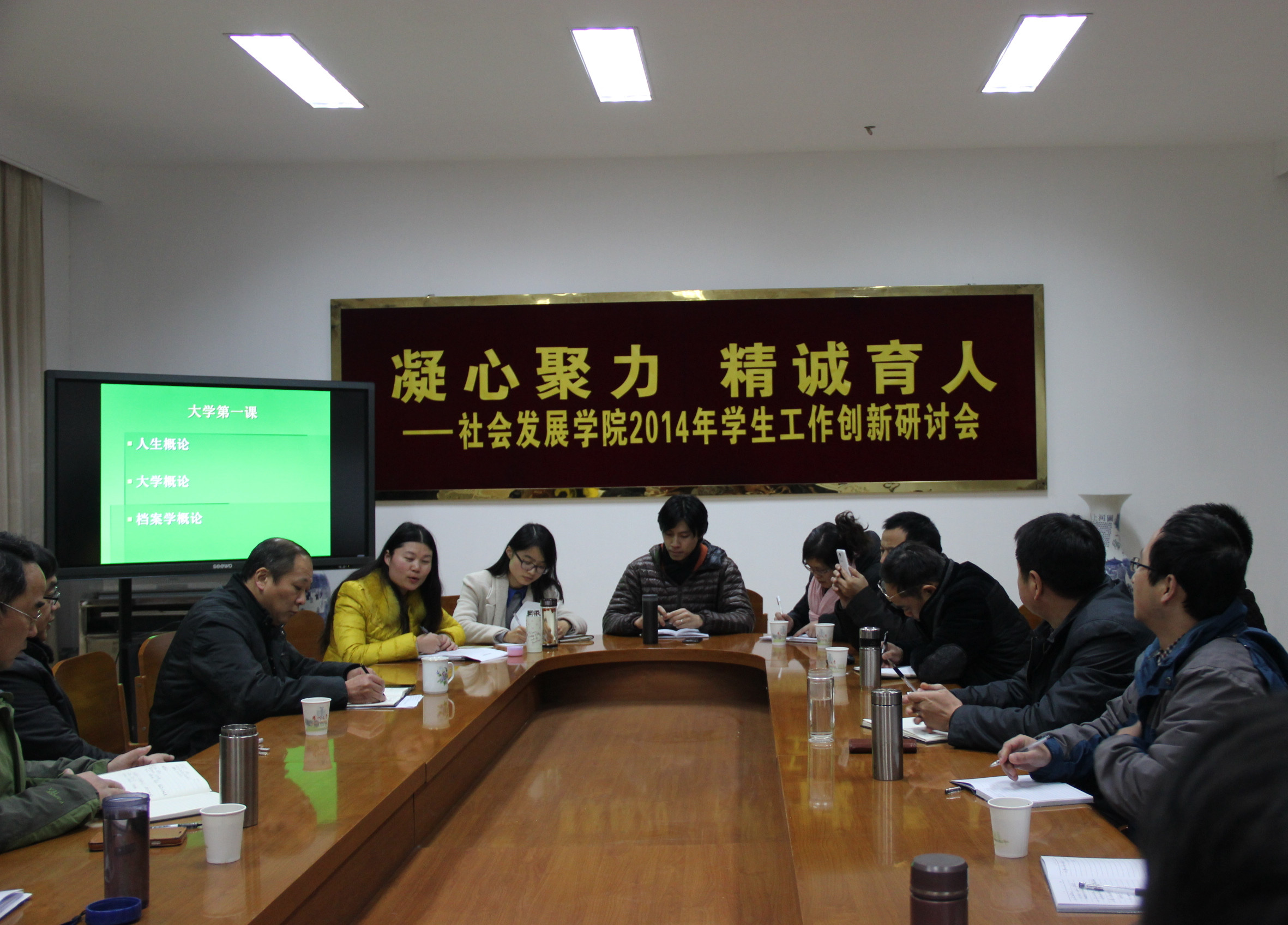 12月10日下午,我院召开2014年学生工作创新研讨会,会议以“凝心聚力,精诚育人”为主题,院团委副书记肖薇老师主持会议,全体院领导和研究生、本科生班主任出席会议。