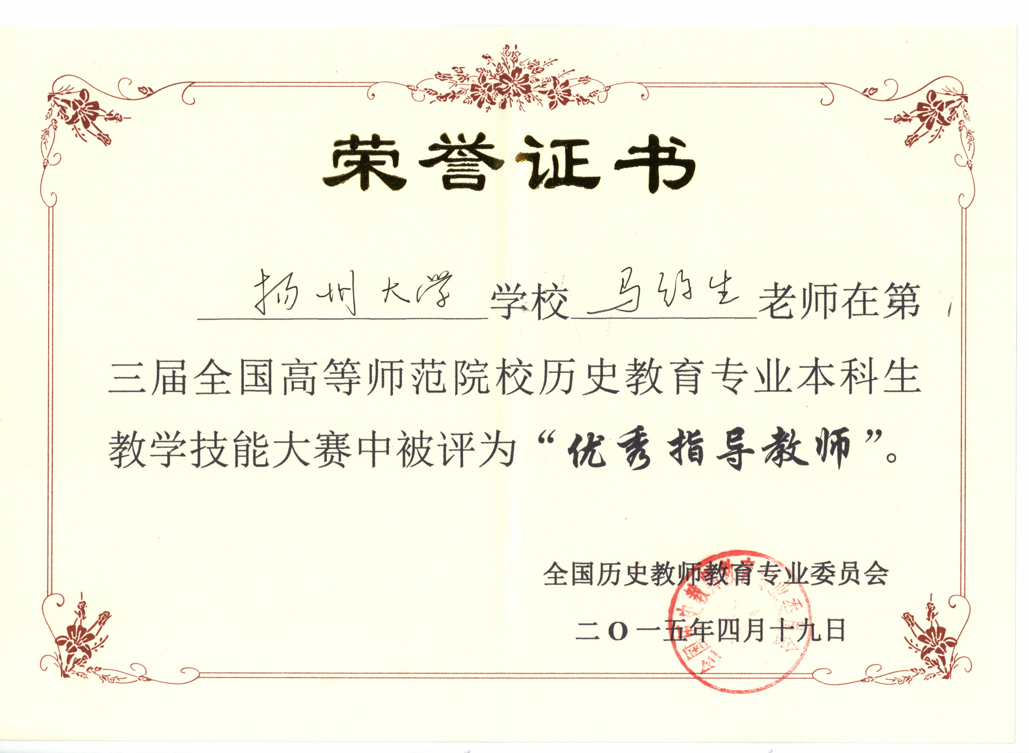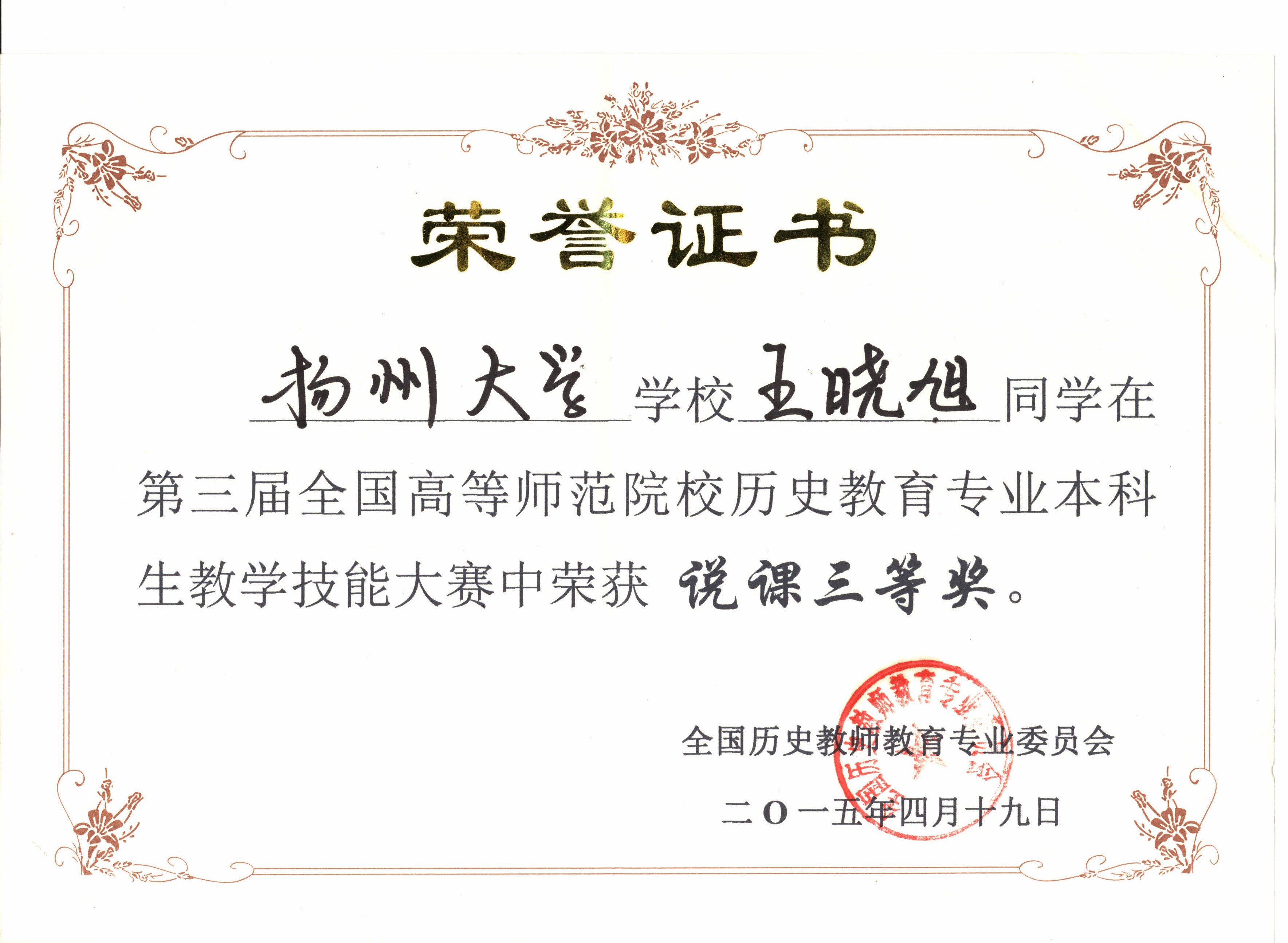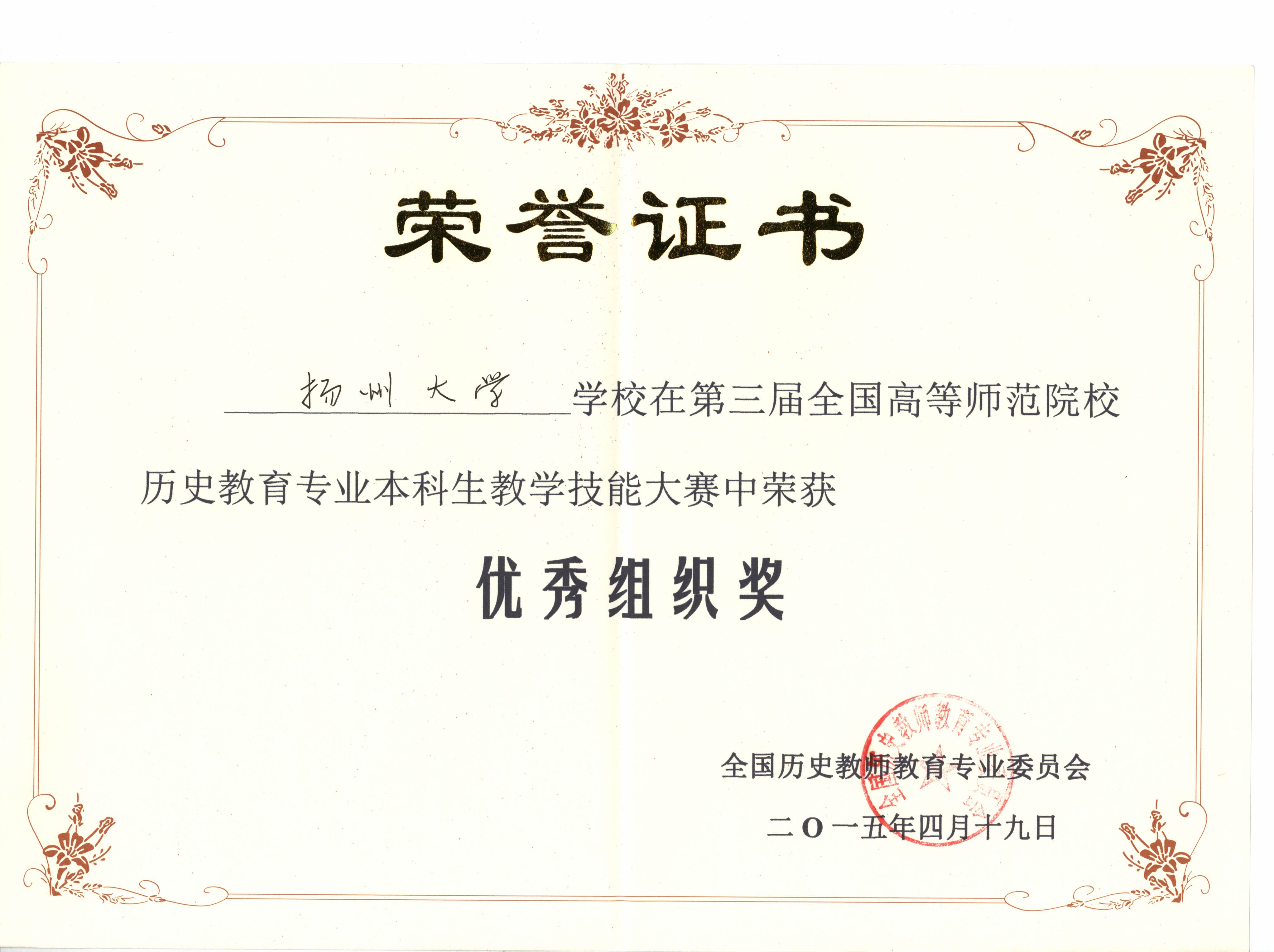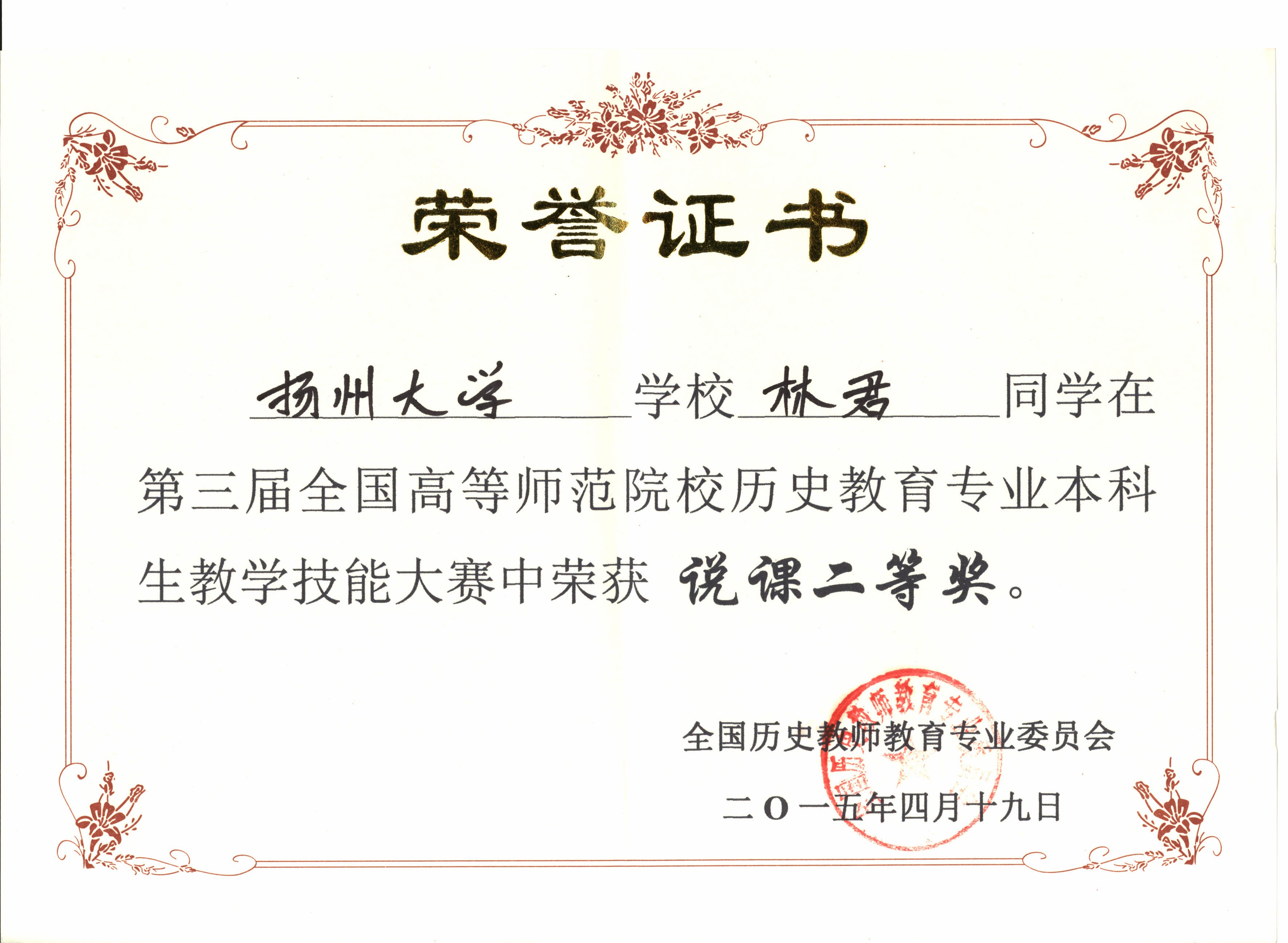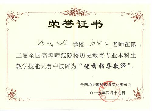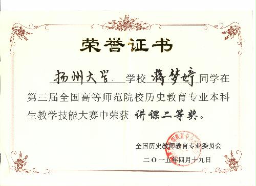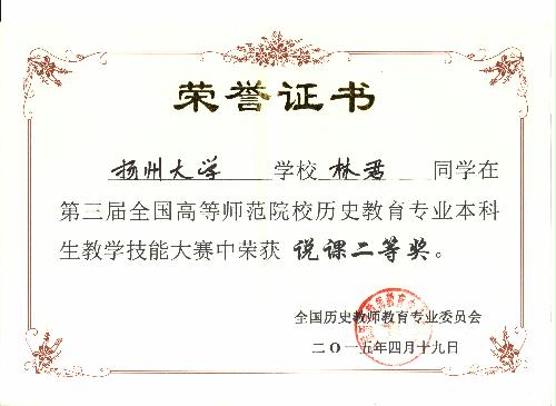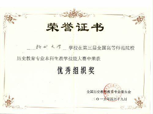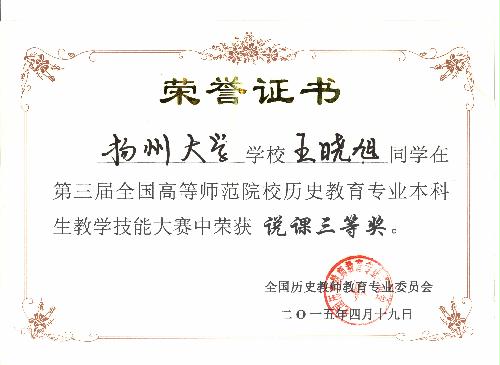 我院在第三届全国高等师范院校历史教育专业本科学生教学技能竞赛中喜获佳绩 4月18—19日,由全国历史教育专业委员会主办的“第三届全国高等师范院校历史教育专业本科学生教学技能竞赛”在山城重庆西南大学成功举办。为加强历史重点专业建设,提高师范生专业技能,我院高度重视,通过周密组织,层层选拔,最终选派历史1101班蒋梦婷、林君、王晓旭三位同学参赛,三位同学均取得较为理想的成绩,其中蒋梦婷获得讲课二等奖,林君获得说课二等奖,王晓旭获得说课三等奖。同时,我院获优秀组织奖,马约生老师获优秀指导教师荣誉称号。