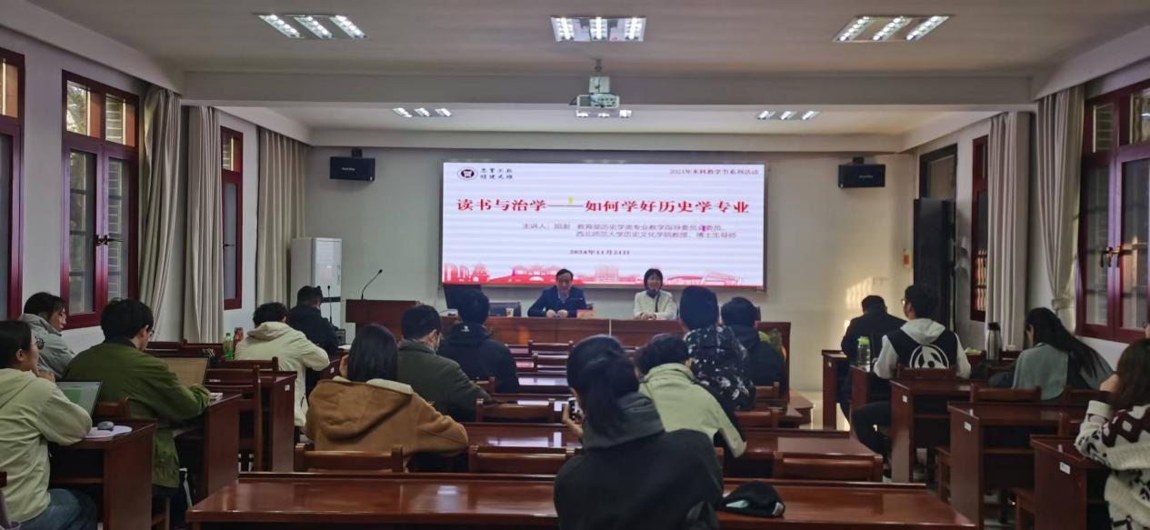 11月21日下午,我院举办2024年本科教学节系列活动——“授业解惑·专家报告会”,教育部历史学类专业教学指导委员会委员、西北师范大学历史文化学院教授田澍应邀莅临我院,在瘦西湖校区44号楼108报告厅为我院师生做了题为《读书与治学—如何学好历史学专业》的学术报告。报告由副院长程海霞主持,学院历史系师生参加了本次活动。