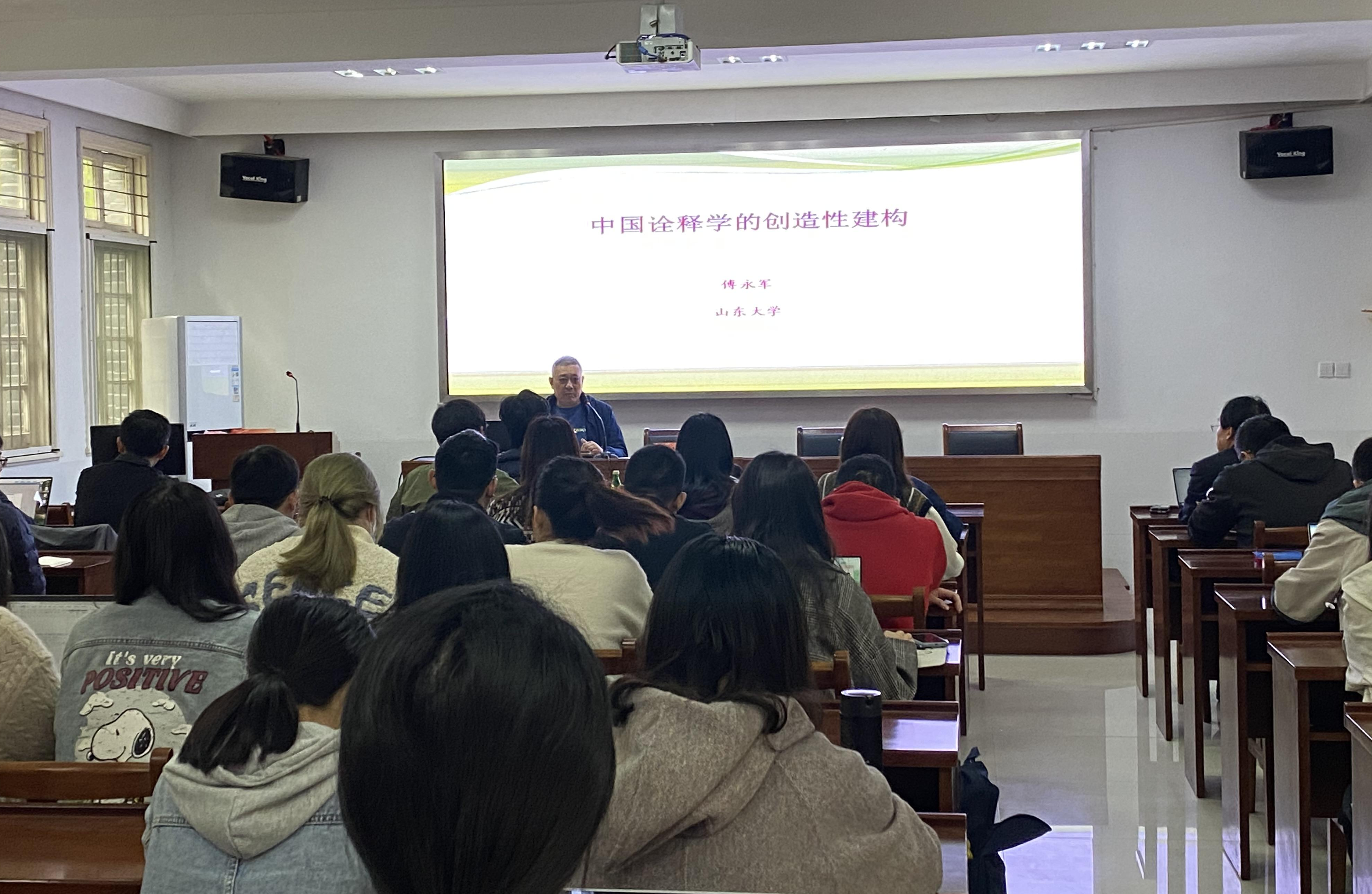 傅教授从西方诠释学在中国的研究历程出发,讲述了中国诠释学创造性建构的任务以及转型需要解决的问题,比较了中西观念史与两种历史性形态,揭示出中国经典诠释的转型方向,解释了经典诠释学在当下的意义。傅教授认为,中国诠释学创造性建构的任务是完成中国经典诠释学从古典形态向现代形态的转型,转型要在中西关系和古今关系的思考中进行。在此过程中需要重视历史,注重研究的方法,了解西方现代诠释学的类型及其提供的参照镜像。最后,傅教授结合中国悠久的经典诠释历史,提出了以中国经典文本为诠释对象的“中国经典诠释学”。傅教授的报告加深了同学们对于中国诠释学的认识和理解,拓宽了同学们的学术视野。
