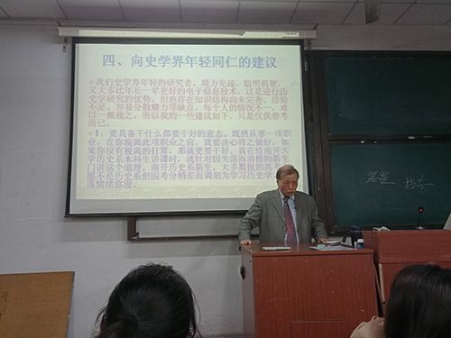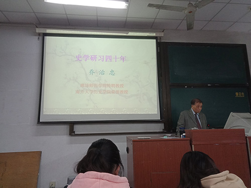 乔先生结合自己从事教学与科研四十余载的切身体会,以《史学研习四十年》为题,从初入史苑的研习、日积月累的学术感悟与创树、研究中国史学史的治学体会、向史学界年轻同仁的建议四个方面,以幽默风趣的语言,将其走上治史的求学历程、治学道路的选择与调整及其背后的故事、治史的经验感悟等,娓娓道来,勉励在场学子要懂得对自己所学专业的坚守、做好专业研究的意志和审时度势的调整。乔先生以金针度人的大度之风,告诫在场青年学子和教师,一定要注重锻炼理论思维与考证功力,指出历史学的研究,无外乎靠理论思维和考证功力两项能力。一个学者可以在这两项中偏重一种,但不能只会其一,最好是两项皆通,都有成果。时至今日的电子时代,史料资源的获得越来越不成问题,于是思维能力更加成为取得学术成就的关键。乔先生指出,从史学方法论层面看,研究方法有三种,即逻辑的方法、历史的方法、系统与层次的考察方法。历史学有一个特点,只要坚持研究,或早或晚一定会出显著成果。年轻学者必须树立写作意识,要写文章、写著述,不能浮躁懈怠。他还结合自己多年评审国家社科基金项目的体会,分享了如何申请、设计申报书的宝贵经验。