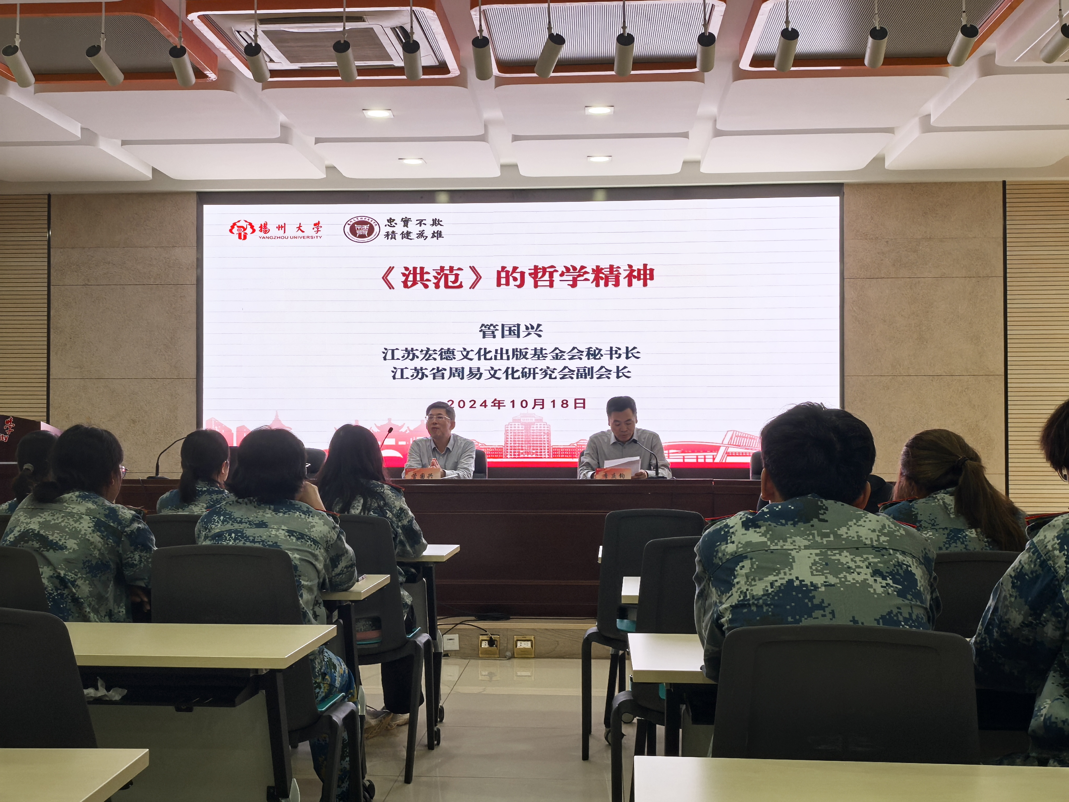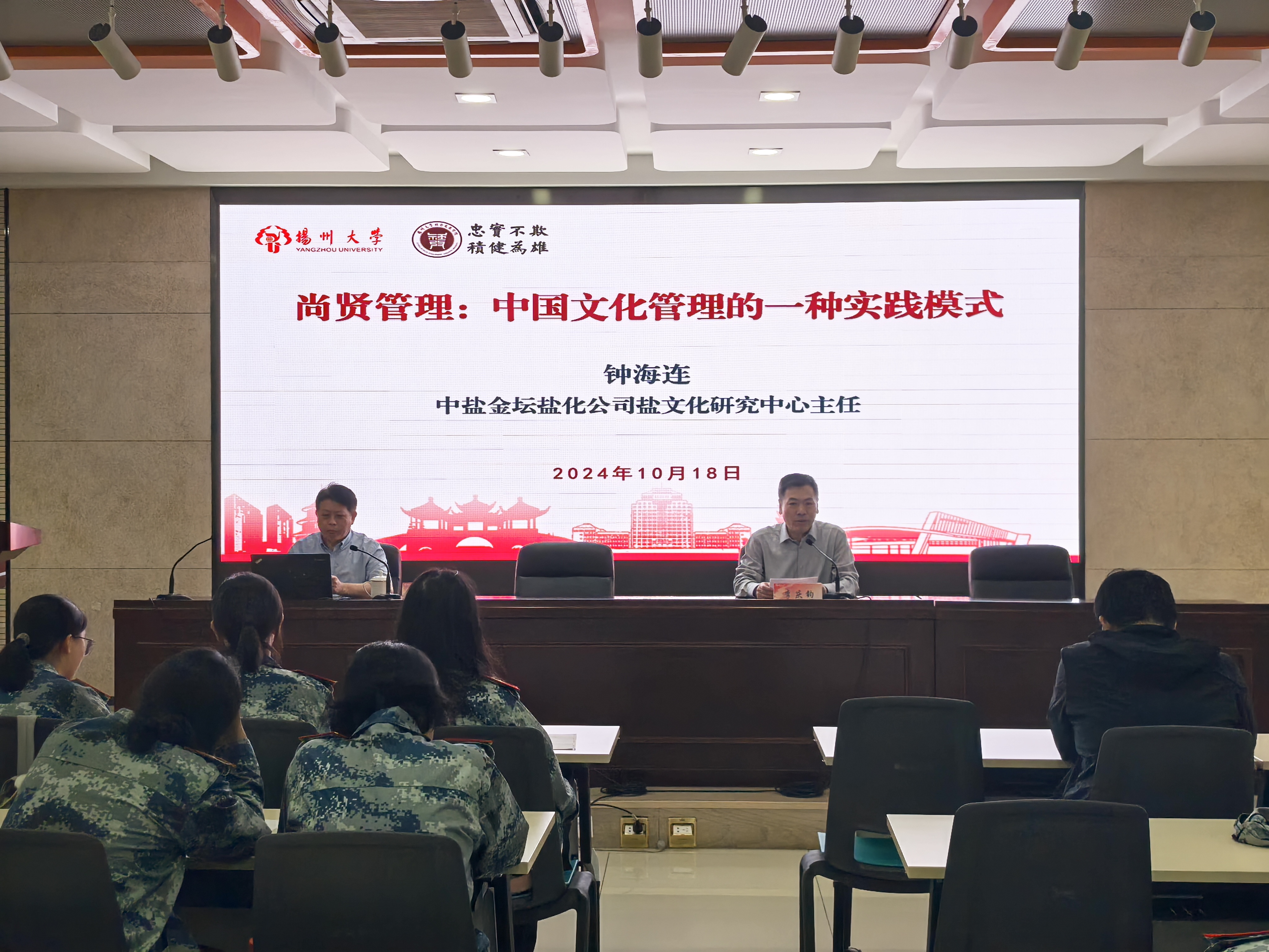 10月18日下午,我院在瘦西湖校区8号楼S205成功举办哲学学术交流会。会议邀请了江苏宏德文化出版基金会秘书长、江苏省周易文化研究会副会长管国兴教授,中盐金坛盐化公司盐文化研究中心主任钟海连教授分别作专题讲座。会议由学院院长李庆钧教授主持,哲学系部分教师和本硕博学生代表参加会议。